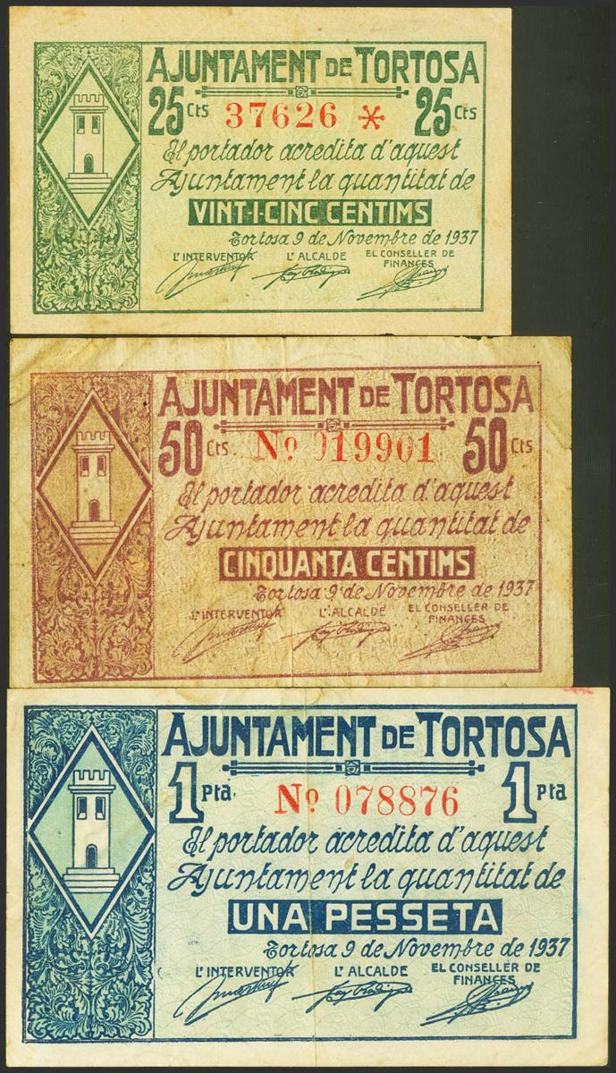 TORTOSA (TARRAGONA). 25 Cents, 50 Cents and 1 Peseta. November 9, 1937. (González: 10410/12). Complete series. Extremely Fine/ Very Fine.