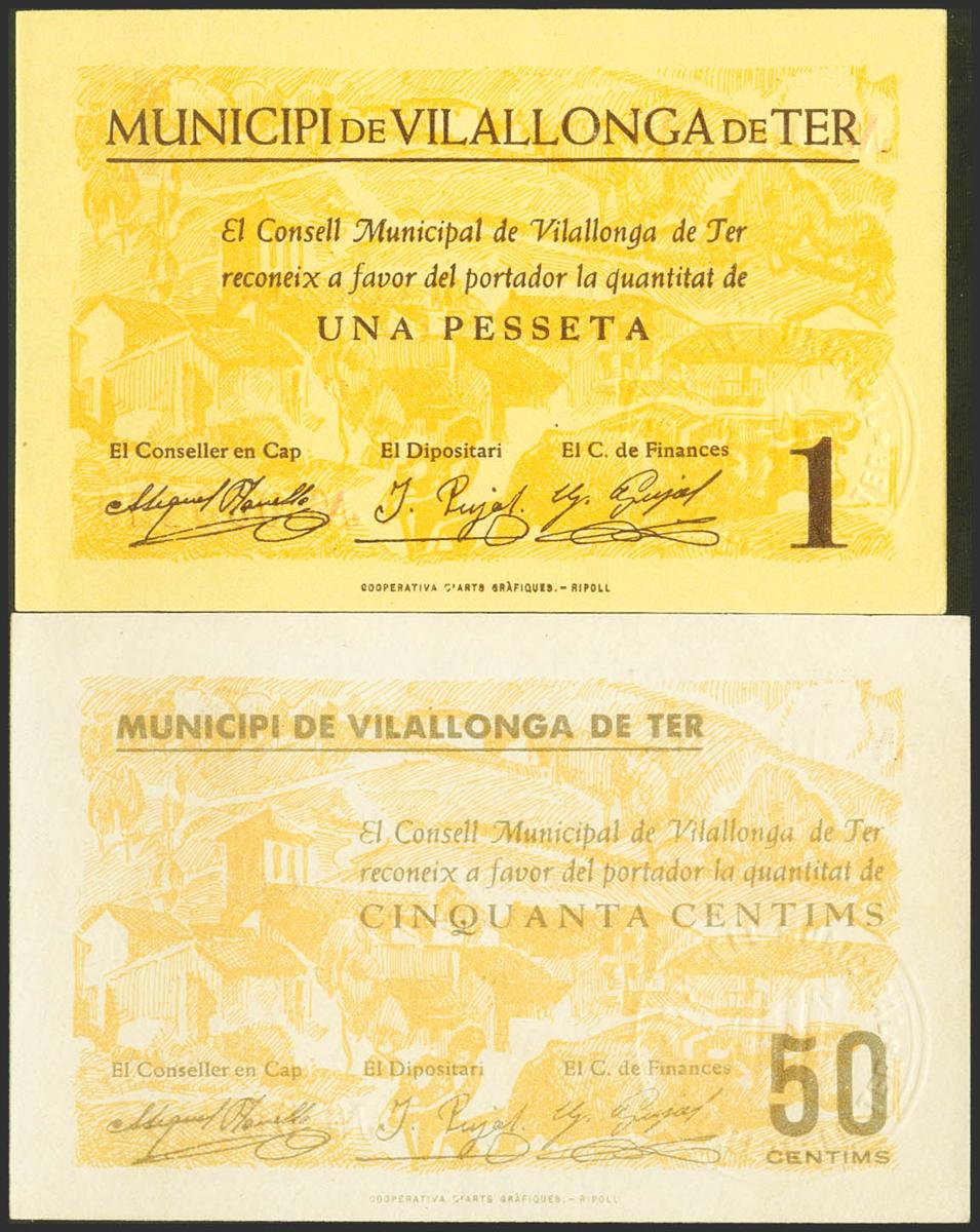 English VILALLONGA DE TER (GERONA). 50 Cents and 1 Peseta. (1937ca). Series A, both. (González: 10753/54). Very rare complete series, especially in this exceptional quality. Almost Uncirculated.