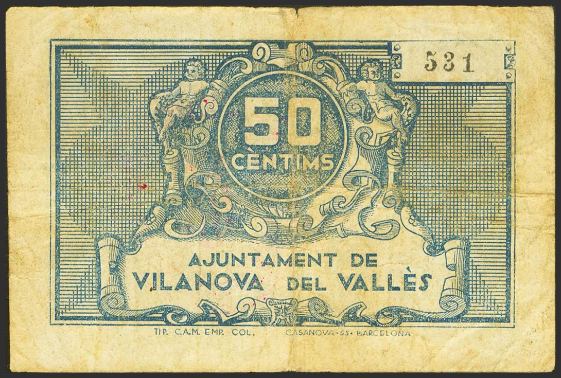 VILANOVA DEL VALLES (BARCELONA). 50 Cents. (1938ca). No serie. (González: 10828). Rare. Almost Very Fine.