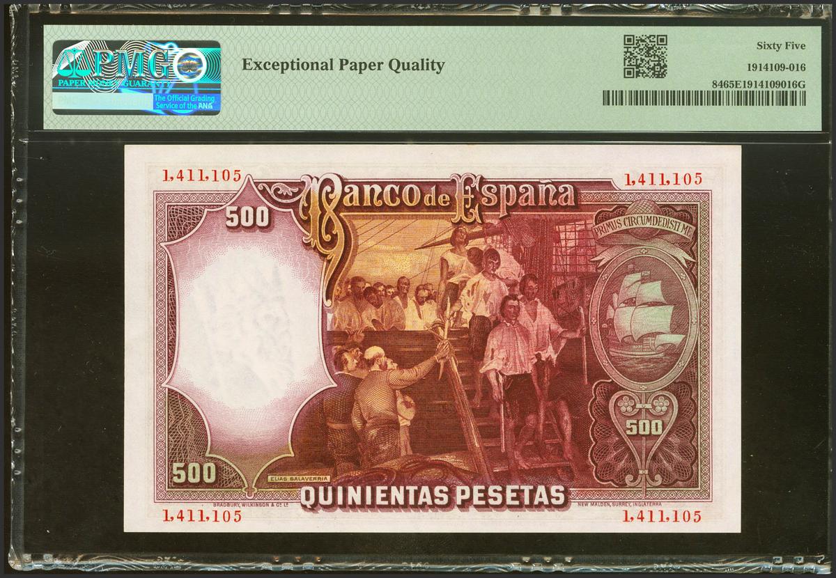 English 500 Pesetas. April 25, 1931. No series. (Edifil 2021: 361, Pick: 84). Unusual in this quality, original sizing. Uncirculated. PMG65EPQ package.