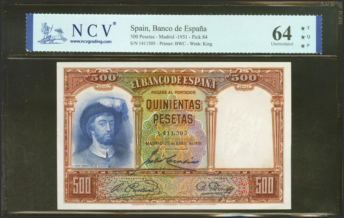 500 Pesetas. April 25, 1931. No series. (Edifil 2021: 361, Pick: 84). Original sizing. Uncirculated. NCV64TPQ package.