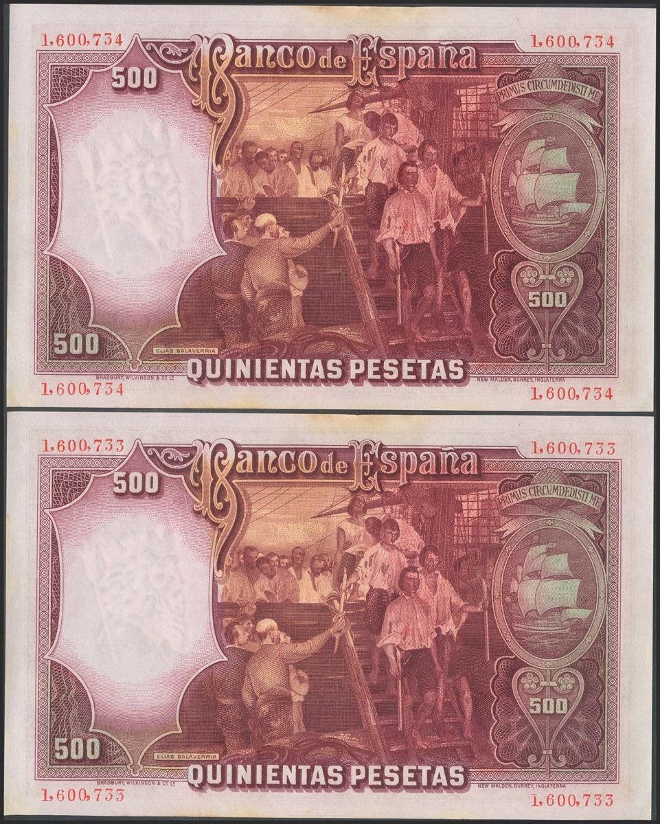 500 Pesetas. April 25, 1931. Correlative pair. No serie. (Edifil 2017: 361). It retains all its original finish, small stains on the upper margin. Good Extremely Fine.