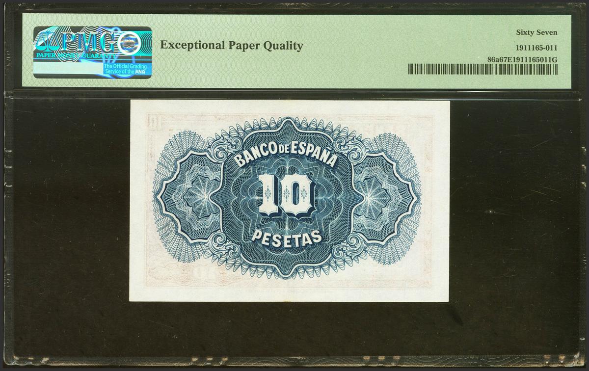 English 10 Pesetas. 1935. Silver Certificate. Series C. (Edifil 2021: 364a, 86a). Very rare in this exceptional quality, original sizing. Uncirculated. PMG67EPQ package.