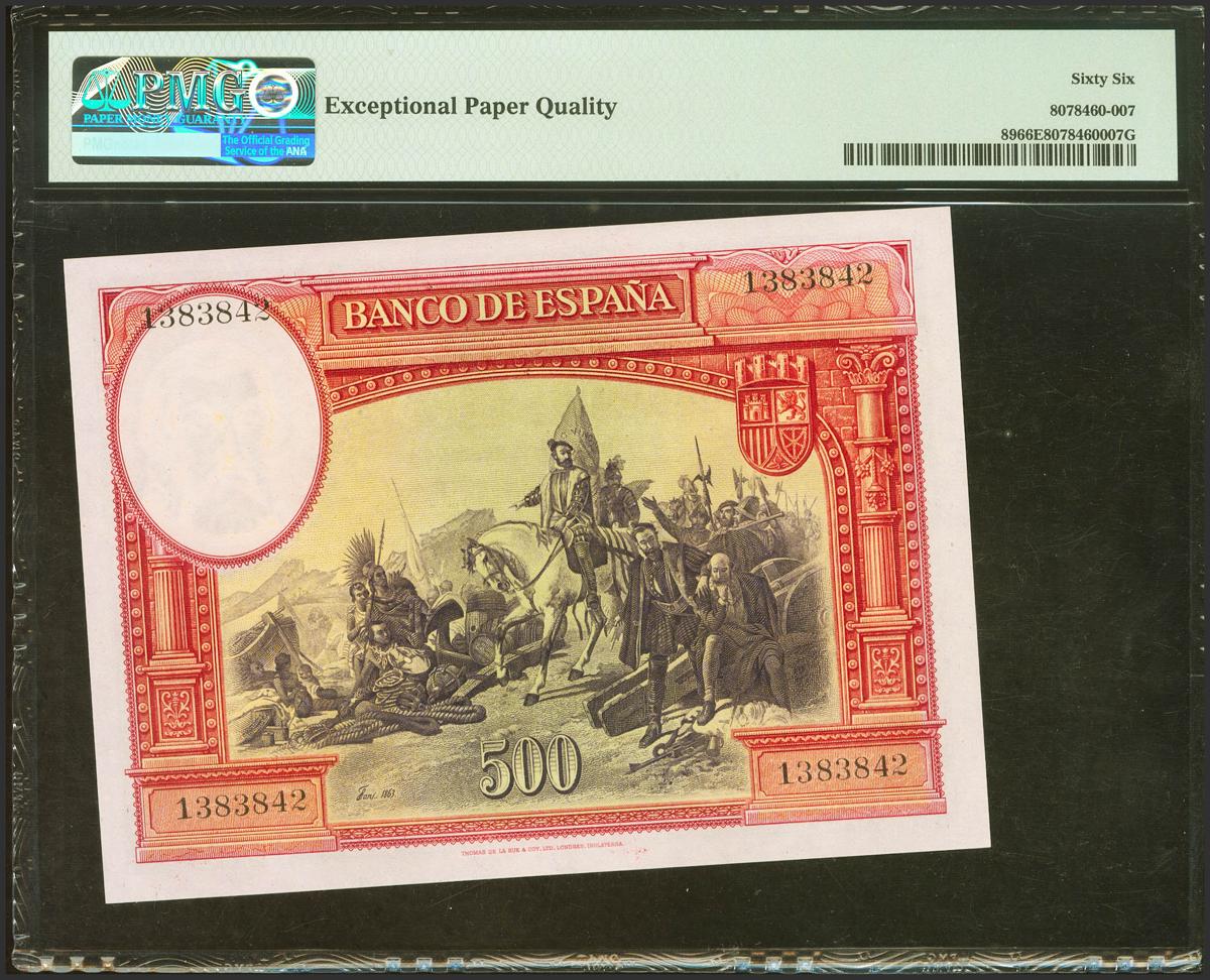 English 500 Pesetas. January 7, 1935. No series. (Edifil 2021: 365, Pick: 89). Original sizing. Uncirculated. PMG66EPQ package.