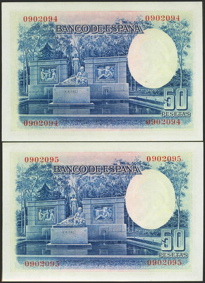 English 50 Pesetas. July 22, 1935. Correlative couple. No serie. (Edifil 2021: 366). Original sizing. Uncirculated.