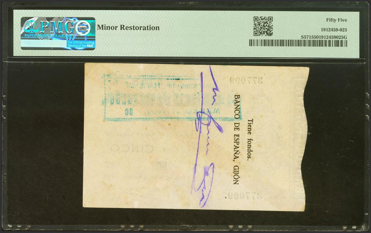 5 Pesetas. November 5, 1936. Gijón Branch. No serie. (Edifil 2021: 380, Pick: S571). Very rare, especially in this exceptional quality for this banknote. Good Extremely Fine. PMG55 encapsulation (minor restoration).