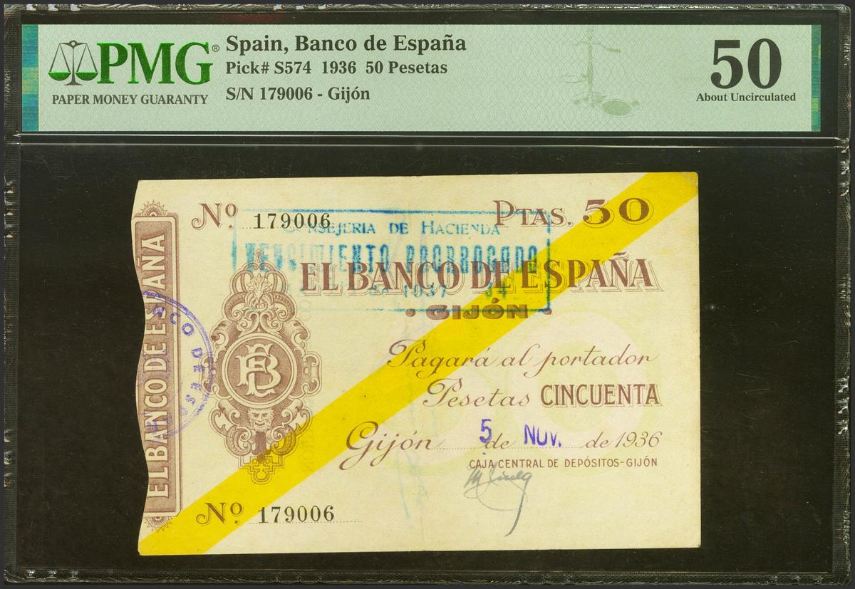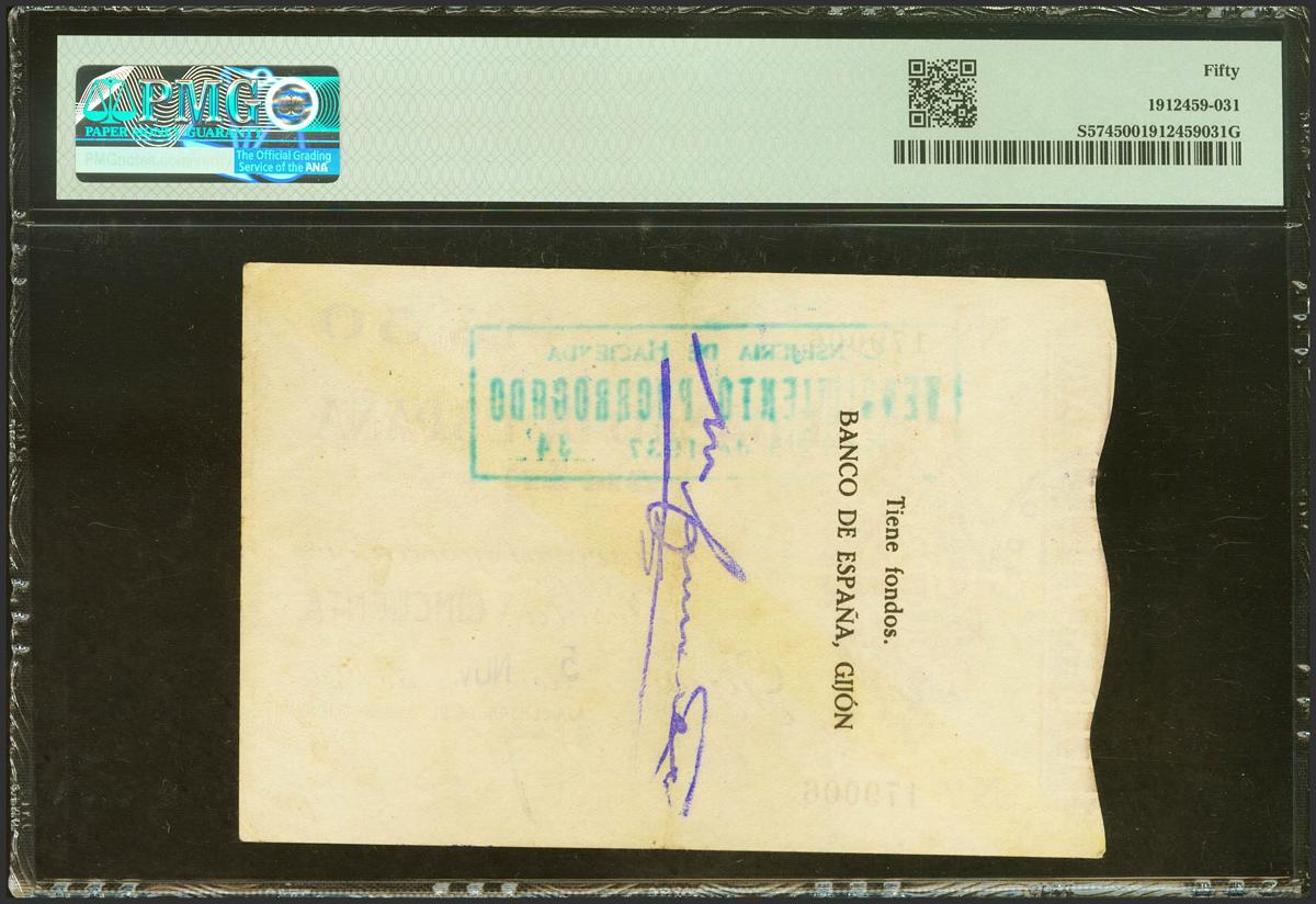 50 Pesetas. November 5, 1936. Gijón Branch. (Edifil 2021: 383, Pick: S574). Rare in this quality. Extremely Fine. PMG50 encapsulation.