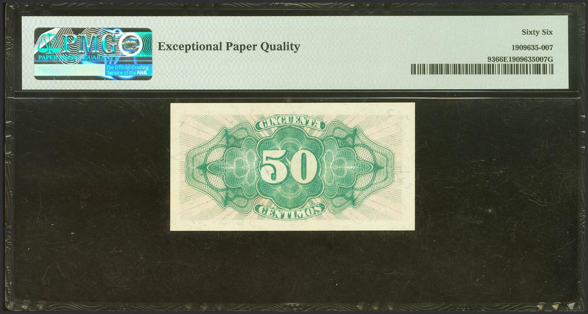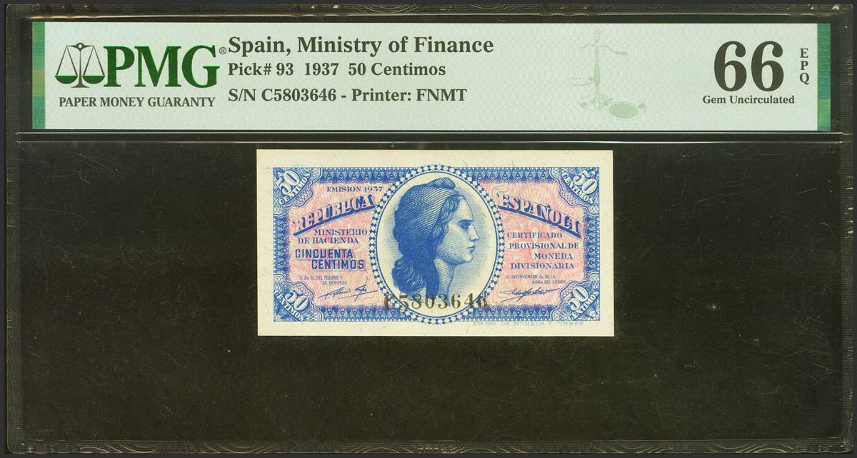 50 Cents. 1937. Ministry of Finance. Series C, last series issued. (Edifil 2021: 391a, Pick: 93). Unusual in this exceptional conservation, original sizing. Uncirculated. PMG66EPQ package.