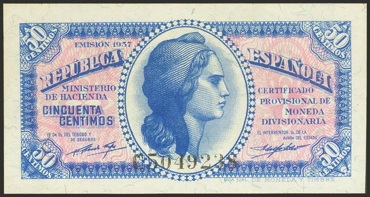English 50 Cents. 1937. Series C, last series issued. (Edifil 2021: 391a). Original sizing. Uncirculated.