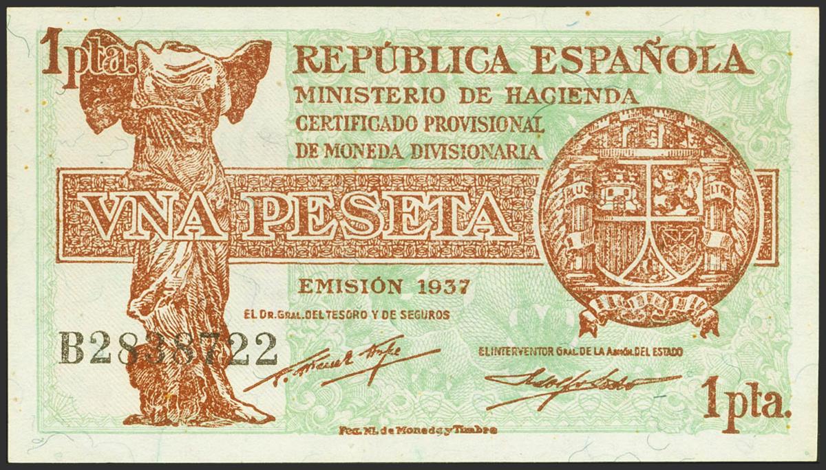 English 1 Peseta. 1937. Series A. (Edifil 2021: 392). Original sizing, typical dots. Uncirculated.