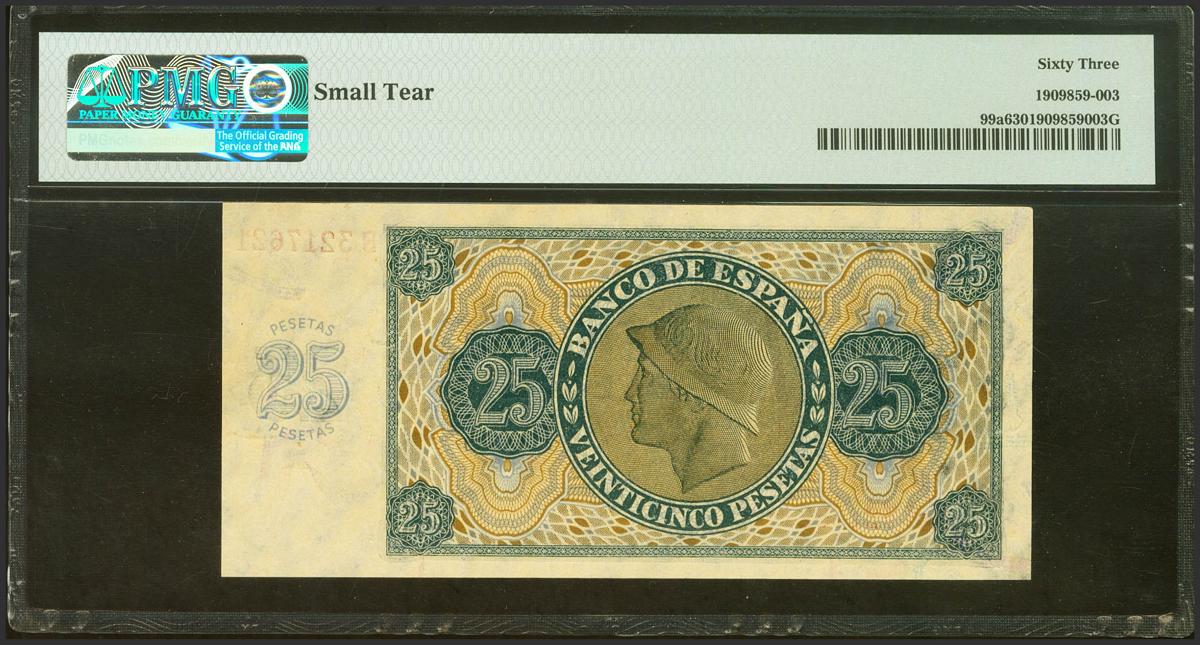 English 25 Pesetas. November 21, 1936. Series S, last series issued. (Edifil 2021: 419a, Pick: 99a). Unusual in this quality. Uncirculated. PMG63 (small tear) encapsulation.