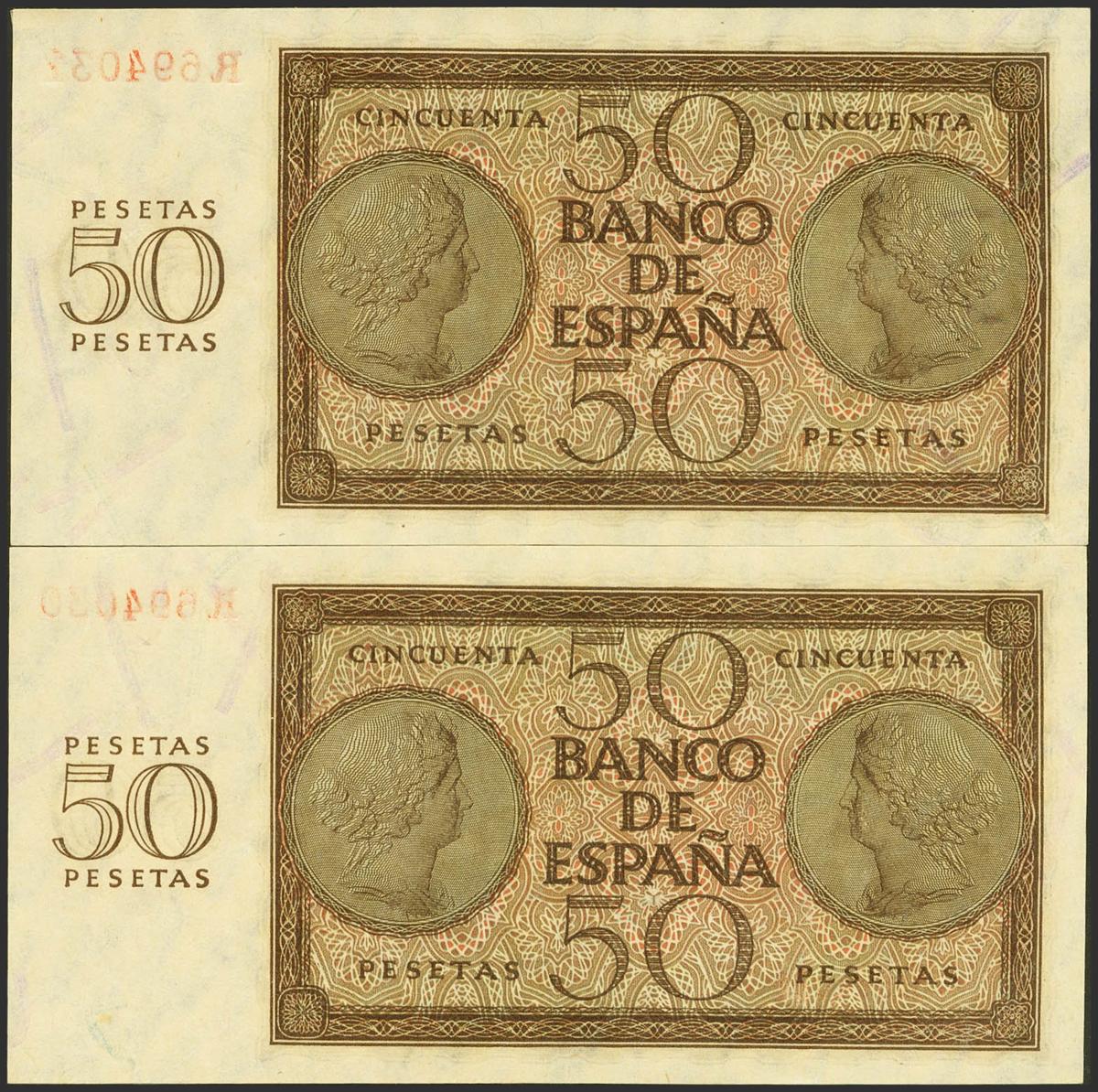 English 50 Pesetas. November 21, 1936. Correlative pair. Series R. (Edifil 2021: 420a). Very rare especially in this superlative quality, it retains all its original finish. Uncirculated.