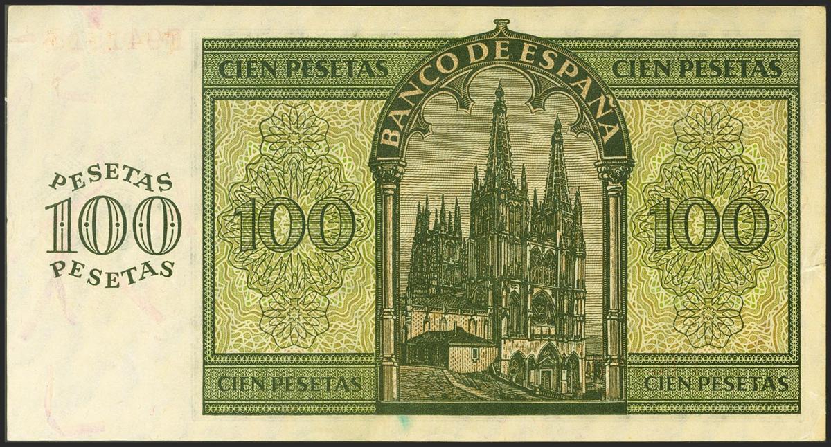 English 100 Pesetas. November 21, 1936. Series F. (Edifil 2021: 421a). It retains part of the original finish. Extremely Fine.