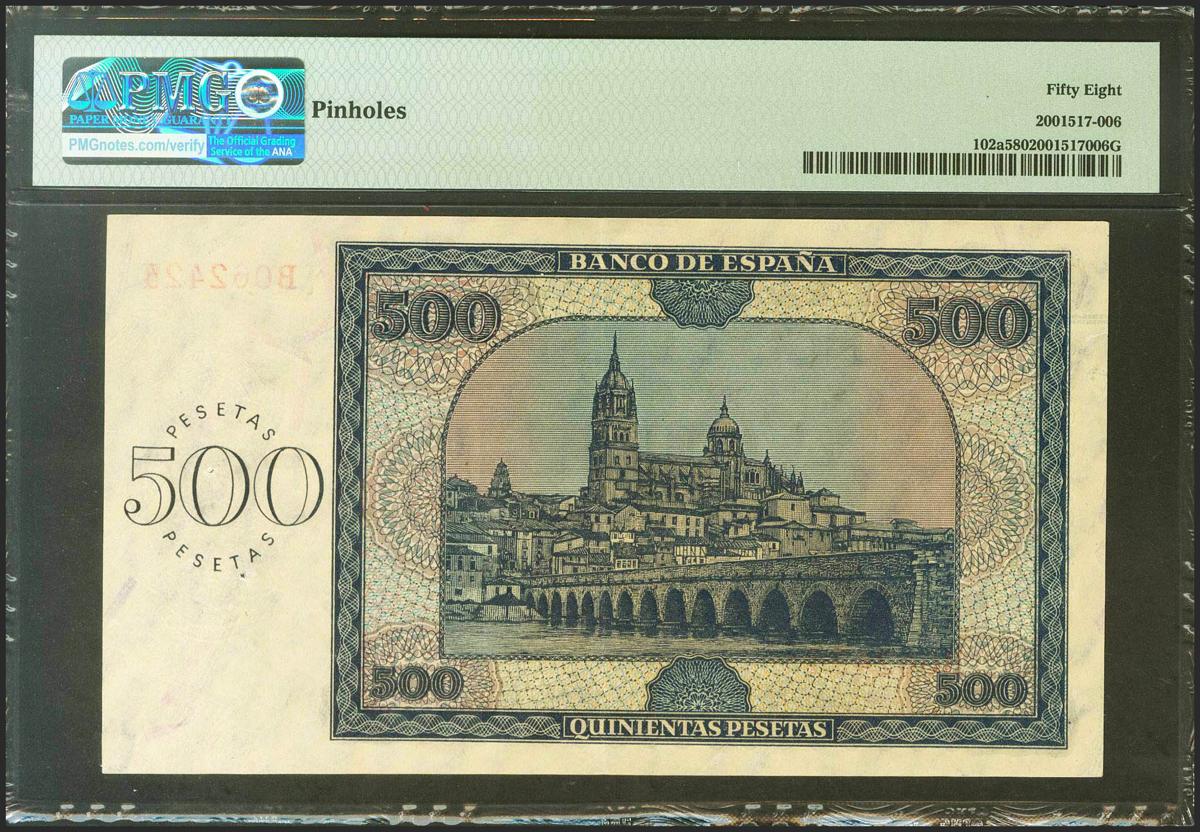 500 Pesetas. November 21, 1936. Series B. (Edifil 2021: 422a, Pick: 102a). Unusual in this quality. EBC++. PMG58 encapsulation.