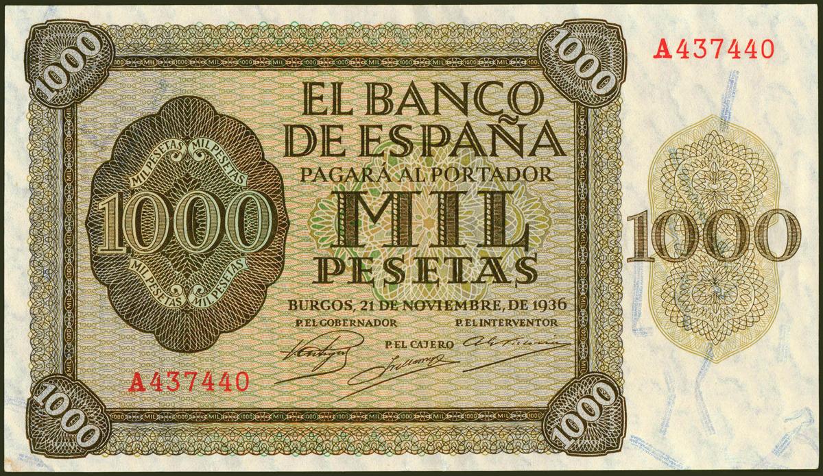 1000 Pesetas. November 21, 1936. Series A. (Edifil 2021: 423). Very rare in this quality, it retains all its original finish. Good Extremely Fine.