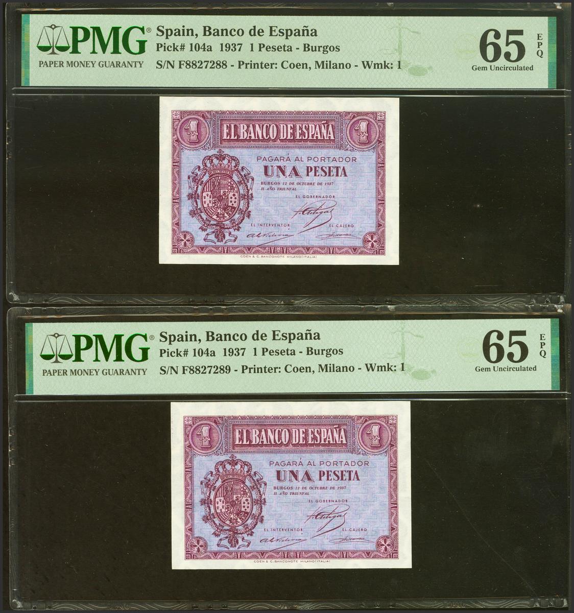 1 Peseta. October 12, 1937. Correlative couple. Series F, last series issued. (Edifil 2021: 425a, Pick: 104a). Original sizing. Uncirculated. PMG65EPQ package.