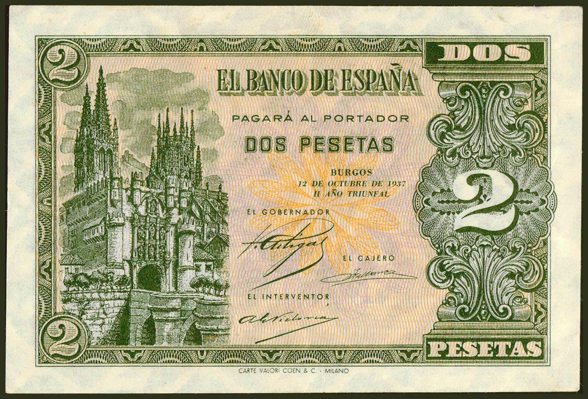 English 2 Pesetas. October 12, 1937. Series A. (Edifil 2021: 426). Unusual in this quality. Almost Uncirculated-.