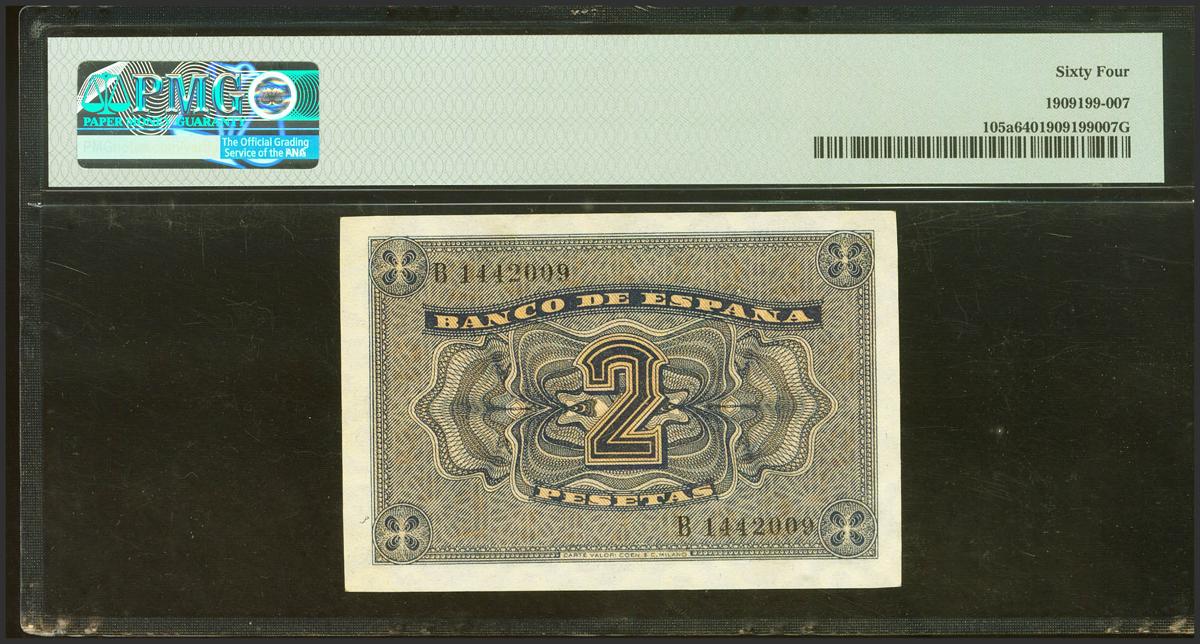 2 Pesetas. October 12, 1937. Series B. (Edifil 2021: 426a). Unusual. Uncirculated. PMG64 encapsulation.