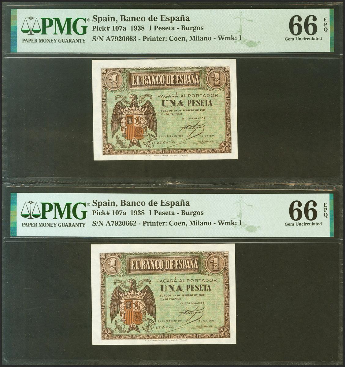 English 1 Peseta. February 28, 1938. Correlative pair. Series A. (Edifil 2021: 427, Pick: 107a). Rare in this exceptional quality, original sizing. Uncirculated. PMG66EPQ package, both.