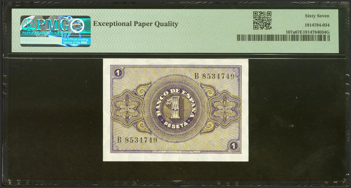 1 Peseta. February 28, 1938. Series B. (Edifil 2021: 427a, Pick: 107a). Very rare in this exceptional quality, original sizing. Uncirculated. PMG67EPQ package.