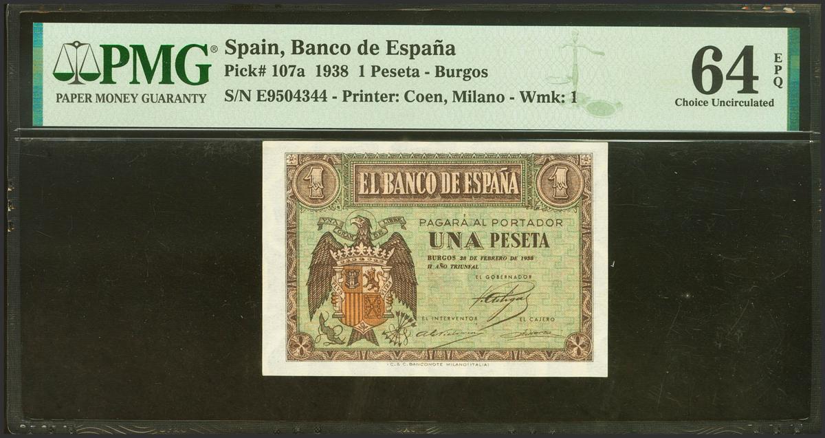 1 Peseta. February 28, 1938. Series E. (Edifil 2021: 427a, Pick: 107a). Original sizing. Uncirculated. PMG64EPQ package.