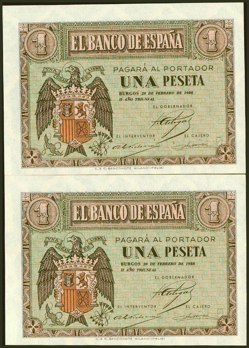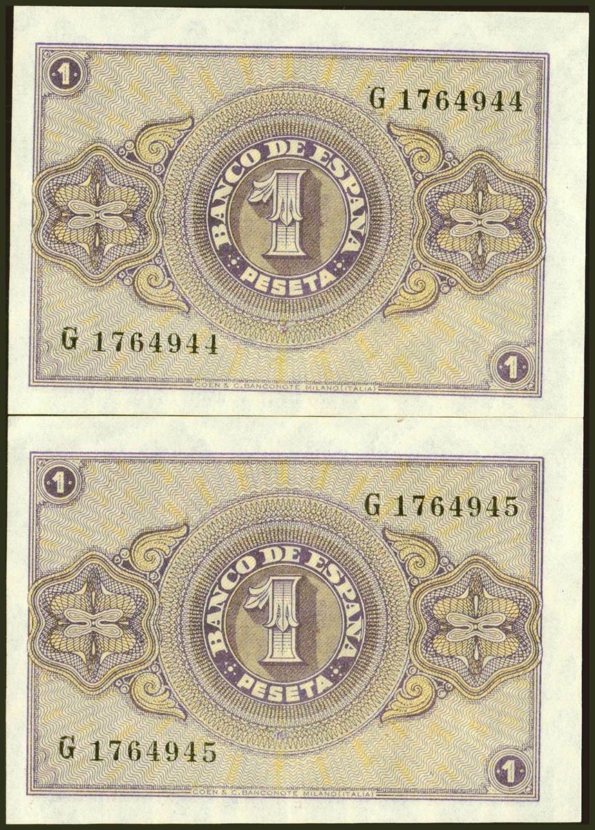1 Peseta. February 28, 1938. Correlative pair. Series G, last series issued. (Edifil 2021: 427b). Unusual series, retains all its original finish. Almost Uncirculated.
