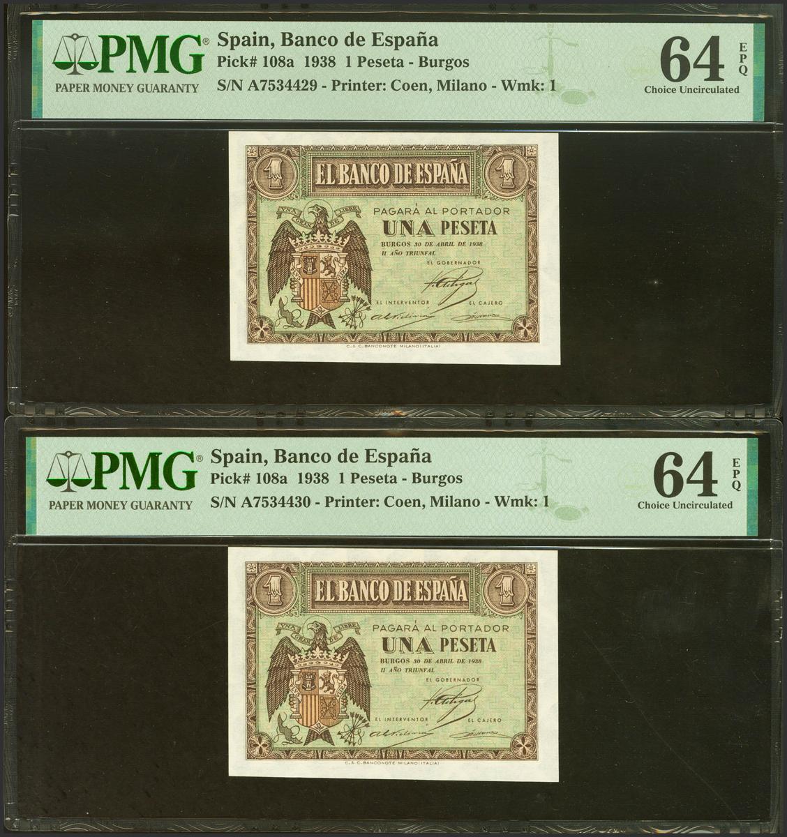 English 1 Peseta. April 30, 1938. Correlative pair. Series A. (Edifil 2021: 428, Pick: 108a). Original sizing. Uncirculated. PMG64EPQ packages, both.