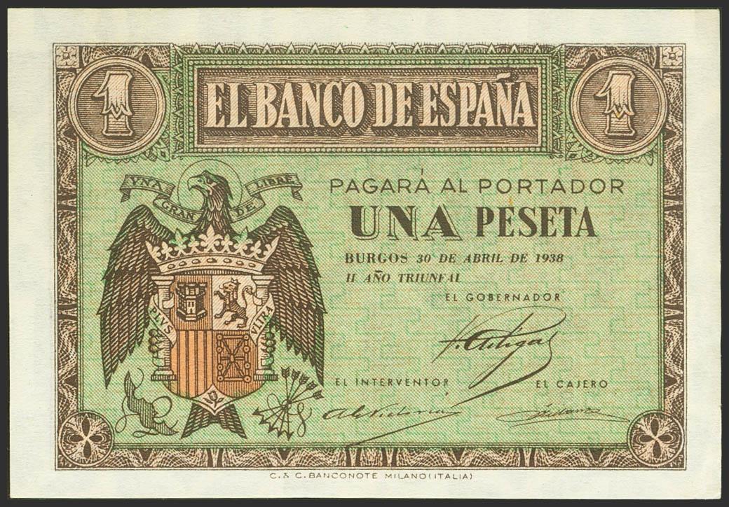 1 Peseta. April 30, 1938. Series C. (Edifil 2021: 428a). Original sizing. Almost Uncirculated.