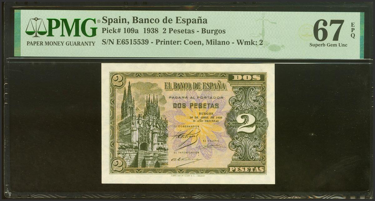 2 Pesetas. April 30, 1938. Series E. (Edifil 2021: 429a, Pick: 109a). Original sizing. Uncirculated. PMG67EPQ package.