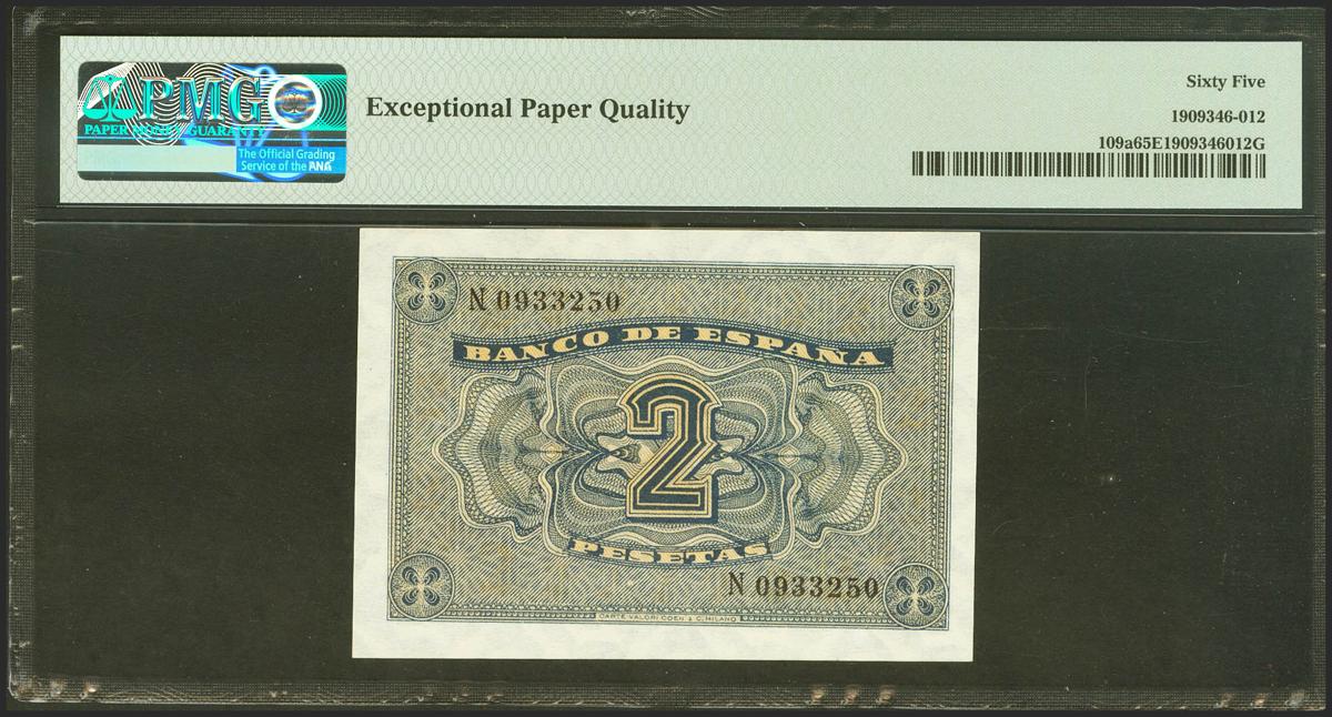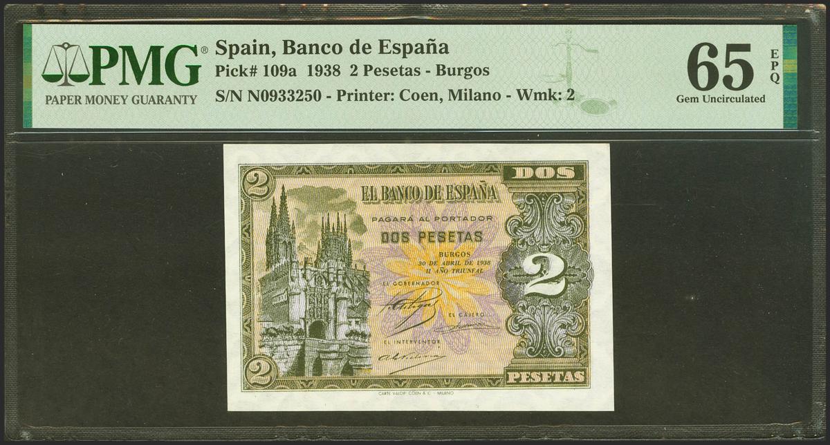 2 Pesetas. April 30, 1938. Series N, last series issued. (Edifil 2021: 429a, Pick: 109a). Unusual in this exceptional quality, original sizing. Uncirculated. PMG65EPQ package.