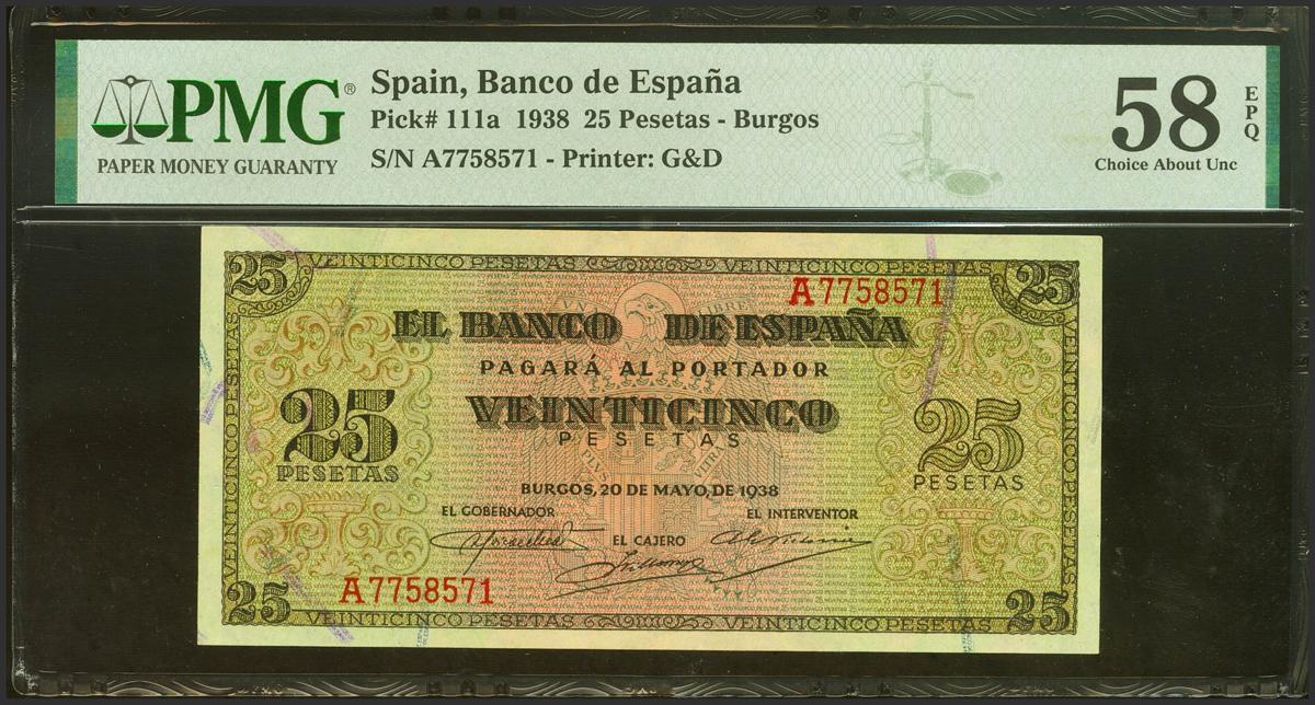 25 Pesetas. May 20, 1938. Series A. (Edifil 2021: 430, Pick: 111a). Original sizing. EBC+++. PMG58EPQ package.
