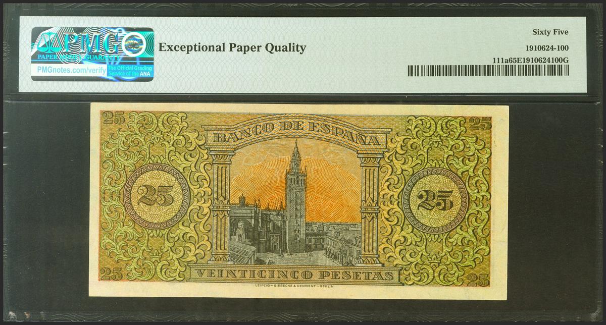 25 Pesetas. May 20, 1938. Series E. (Edifil 2021: 430a, Pick: 111a). Unusual in this quality, original sizing. Uncirculated. PMG65EPQ package.