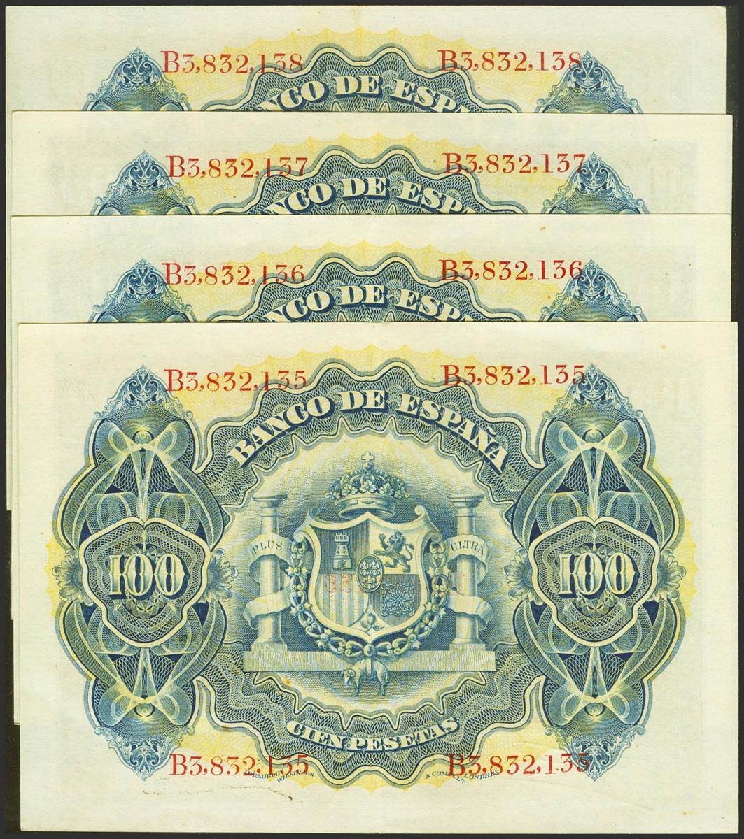 Interesting set of 4 consecutive 100 Pesetas banknotes issued on June 30, 1906, all of them with series B (Edifil 2021: 313a). It retains part of its original finish, a rare set. Good Extremely Fine.
