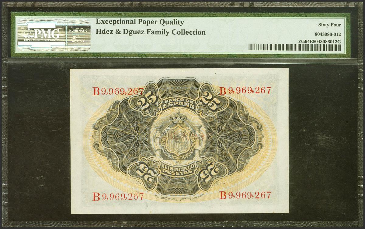 25 Pesetas. September 24, 1906. Series B. (Edifil 2021: 314a, Pick: 57a). Very rare in this exceptional quality, original sizing. Uncirculated. Encapsulated PMG64EPQ (to give us an idea of the rarity, as of September 1, 2023, this note is the sixth highest rated along with four other notes in PMG).