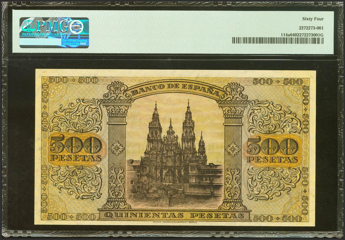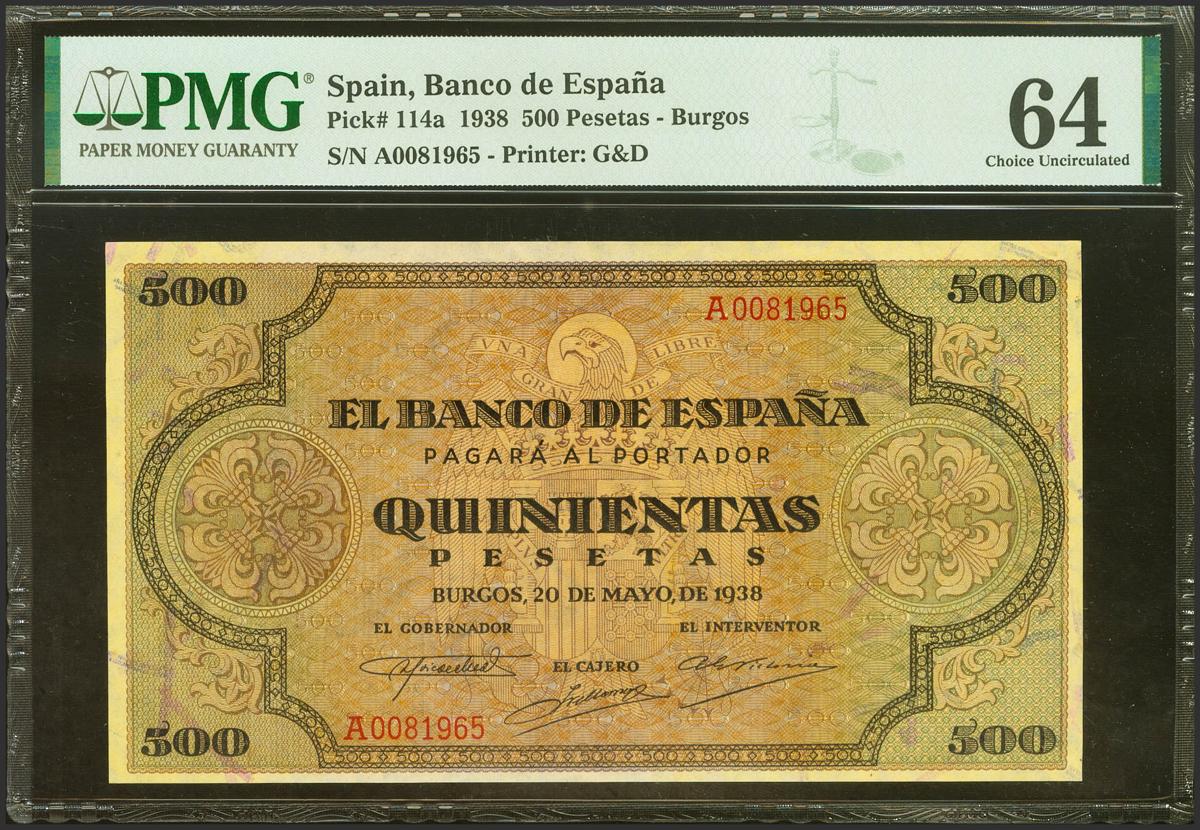 500 Pesetas. May 20, 1938. Series A. (Edifil 2021: 433, Pick: 114a). Rare in this exceptional quality. Uncirculated. PMG64 encapsulation.