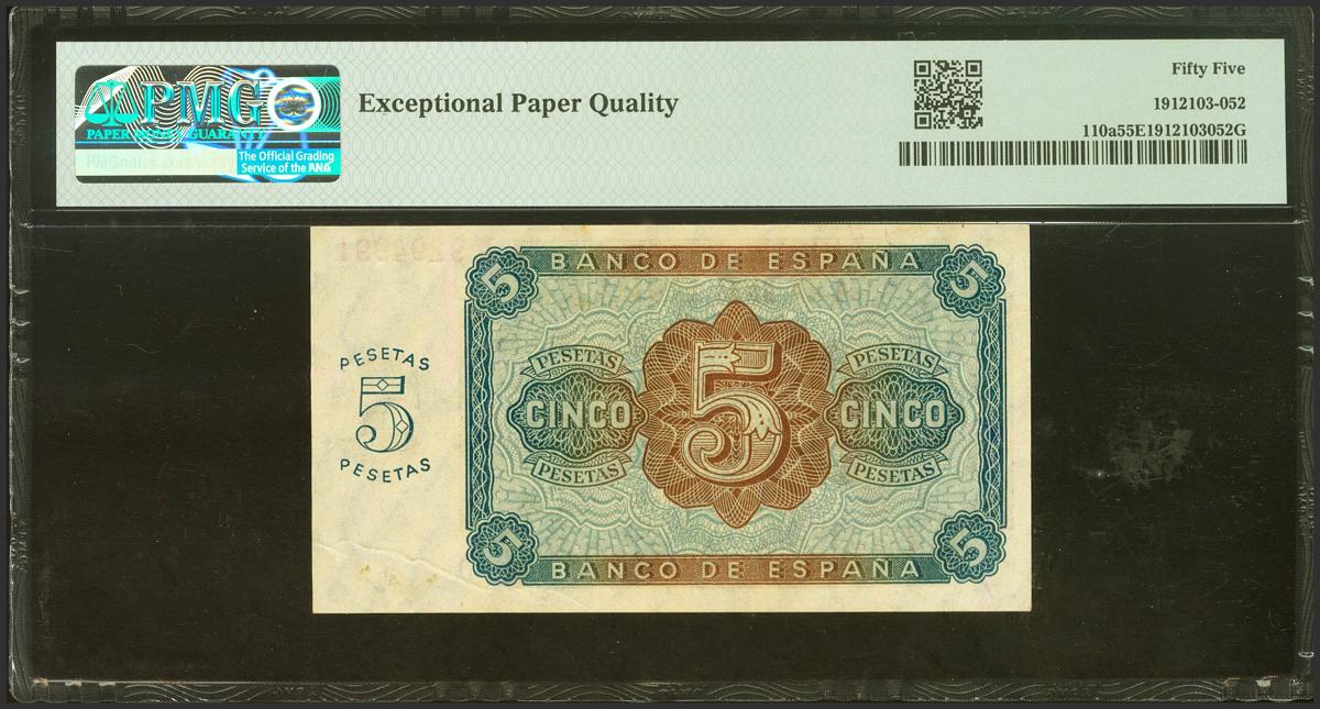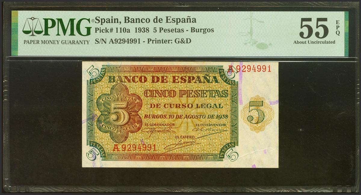 5 Pesetas. August 10, 1938. Series A. (Edifil 2021: 435). Original sizing. Good Extremely Fine. PMG55EPQ package.