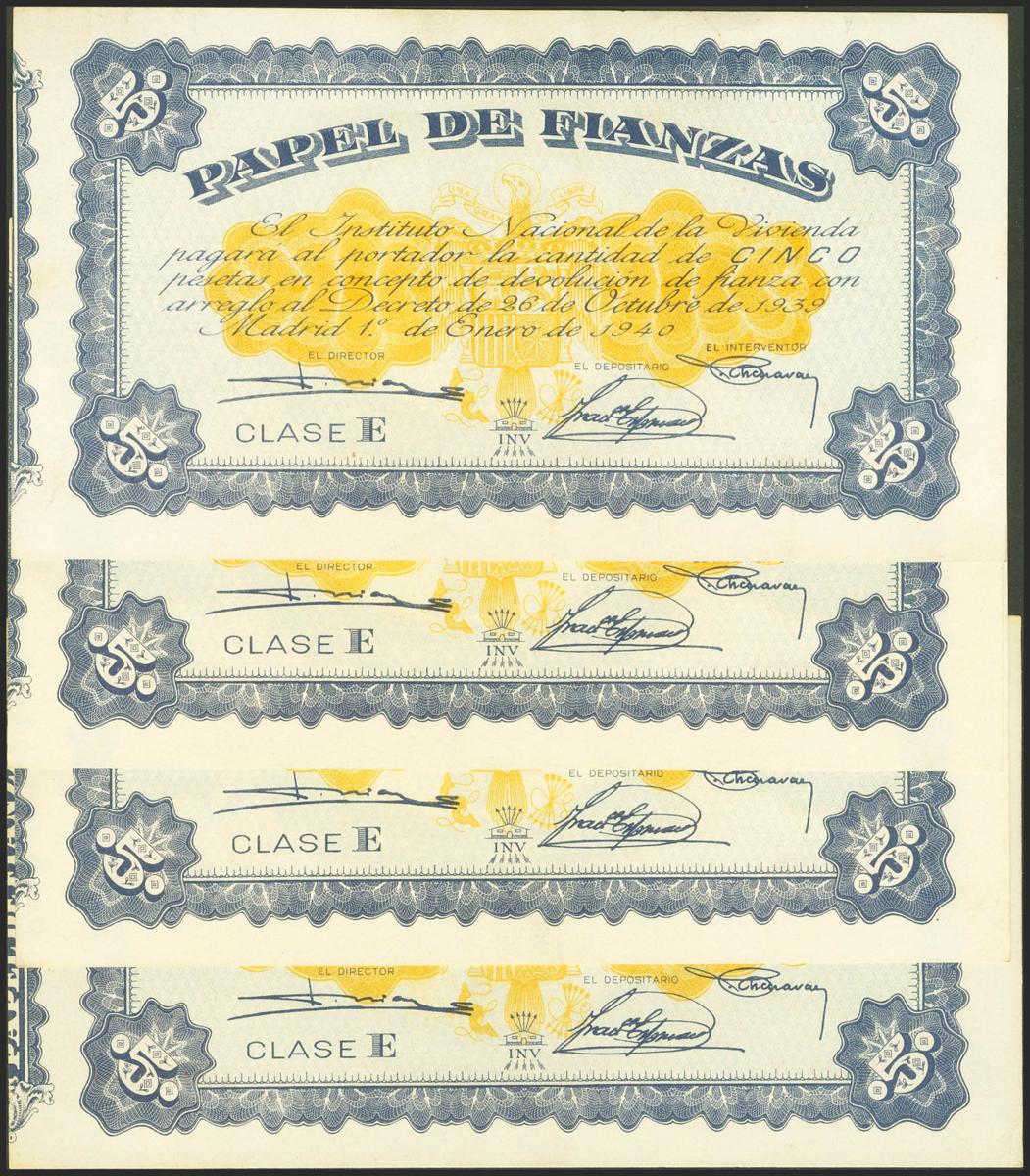 Set of 4 5 Peseta Finance Paper banknotes issued on January 1, 1940, all of them with the series A. Almost Uncirculated-.