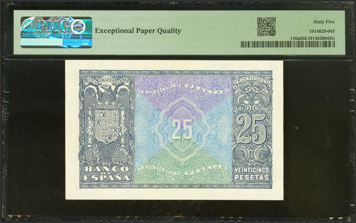 25 Pesetas. January 9, 1940. Series D. (Edifil 2021: 436a). Original sizing. Uncirculated. PMG65EPQ package.