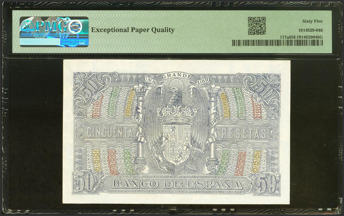50 Pesetas. January 9, 1940. Series B. (Edifil 2021: 437a). Original sizing, rare in this quality. Uncirculated. PMG65EPQ package.