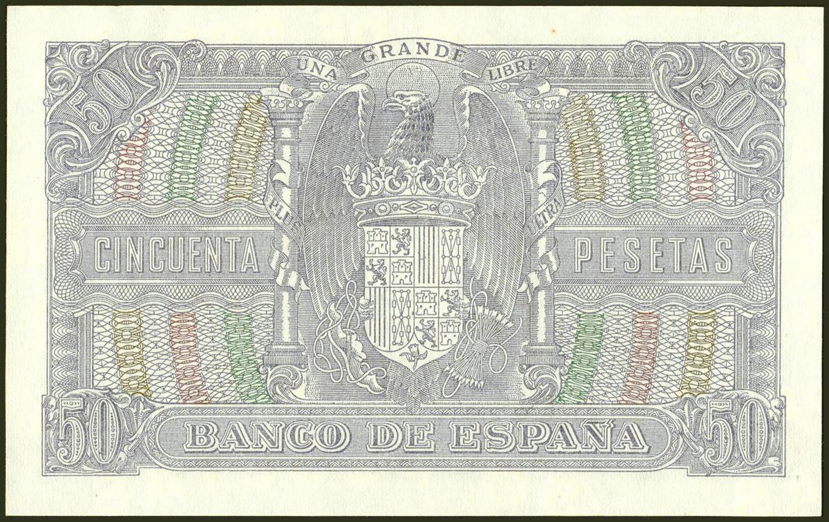 50 Pesetas. January 9, 1940. Series D. (Edifil 2021: 437a). It retains part of its original finish. Extremely Fine.
