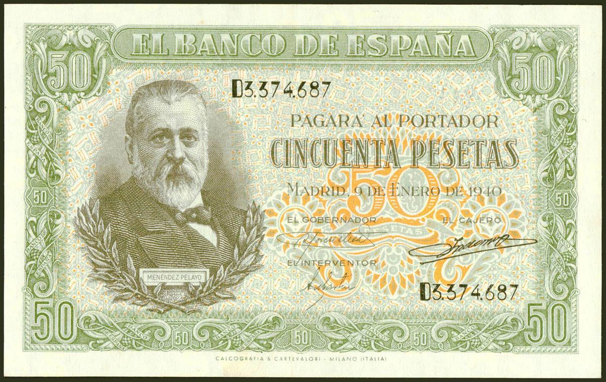 50 Pesetas. January 9, 1940. Series D. (Edifil 2021: 437a). It retains part of its original finish. Extremely Fine.