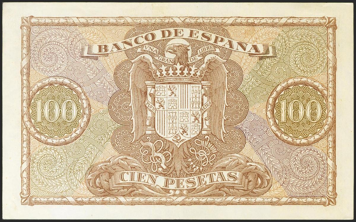 100 Pesetas. January 9, 1940. Series E. (Edifil 2021: 438a, Pick: 118a). It retains much of its original finish. Almost Uncirculated-.