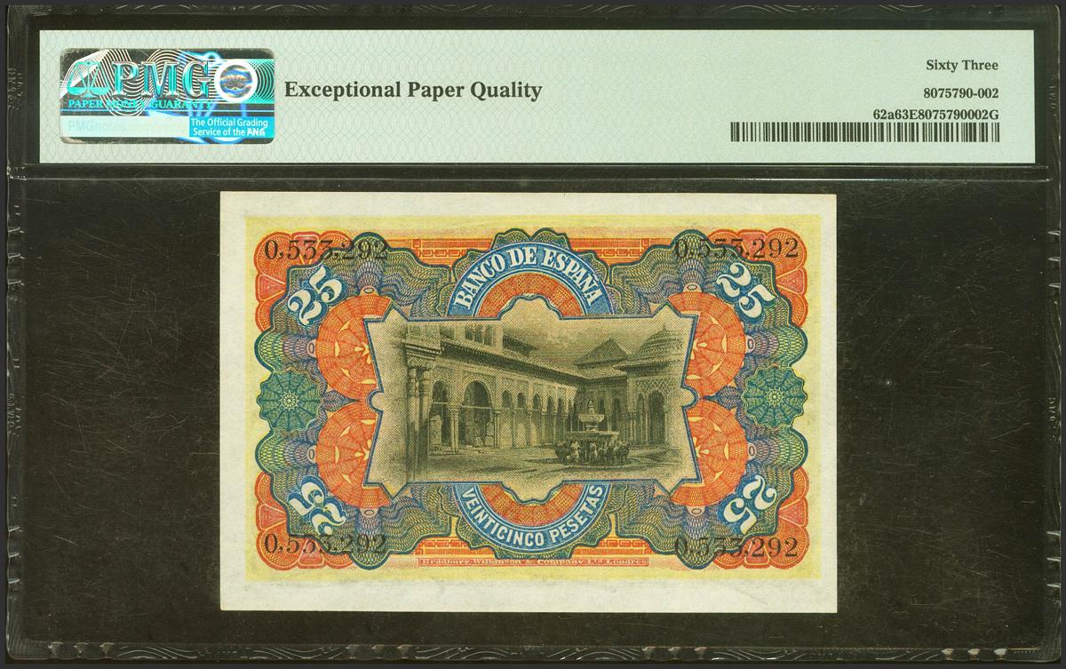 25 Pesetas. July 15, 1907. No series. (Edifil 2021: 318, Pick: 62a). Very rare, especially in this exceptional quality, original sizing. Uncirculated. Encapsulated PMG63EPQ (to give us an idea of the rarity, as of September 1, 2023, this note is the cuarto highest graded in PMG).
