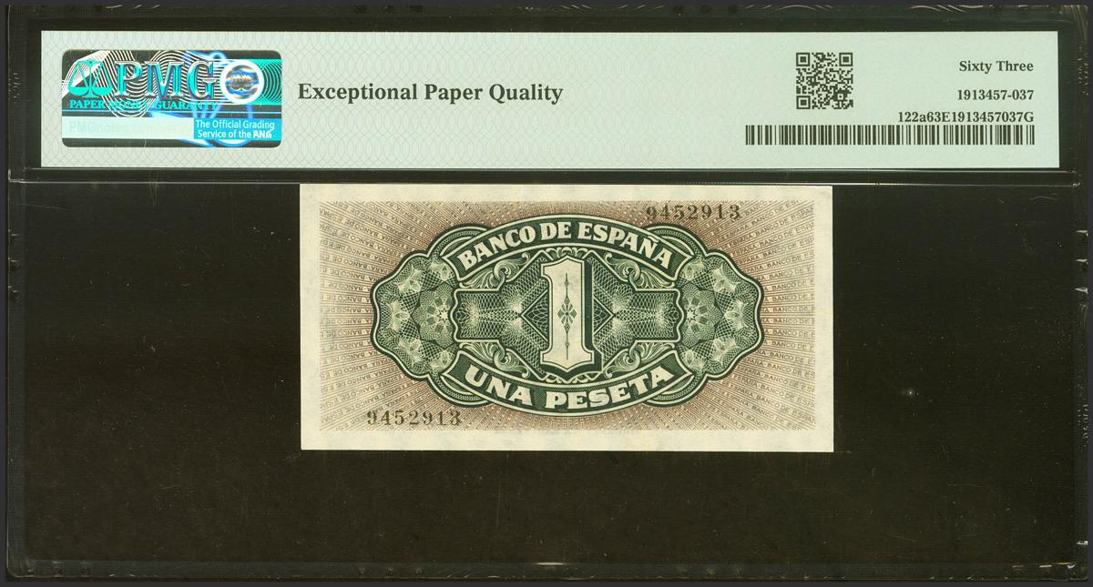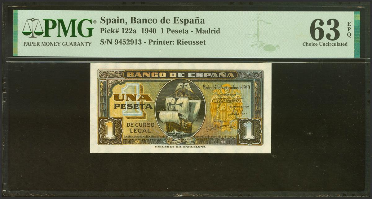 English 1 Peseta. September 4, 1940. No series. (Edifil 2021: 442, Pick: 122a). Original sizing. Uncirculated. PMG63EPQ package.