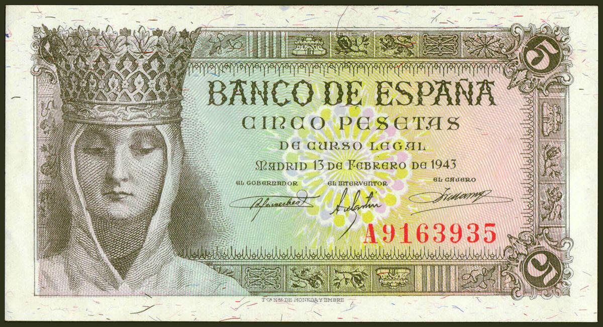 5 Pesetas. February 13, 1943. Series A. (Edifil 2021: 446a). Original sizing. Almost Uncirculated.