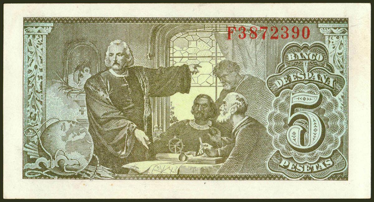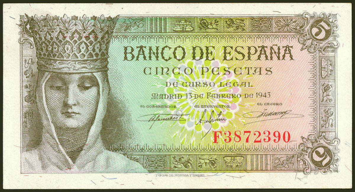 5 Pesetas. February 13, 1943. Series F. (Edifil 2021: 446a). Original sizing. Almost Uncirculated.