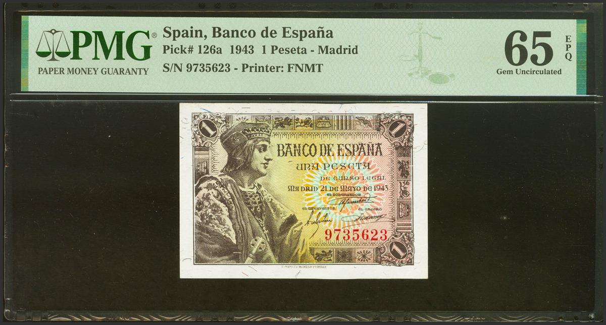 1 Peseta. May 21, 1943. No series. (Edifil 2021: 447, Pick: 126a). Unusual in this quality, original sizing. Uncirculated. PMG65EPQ package