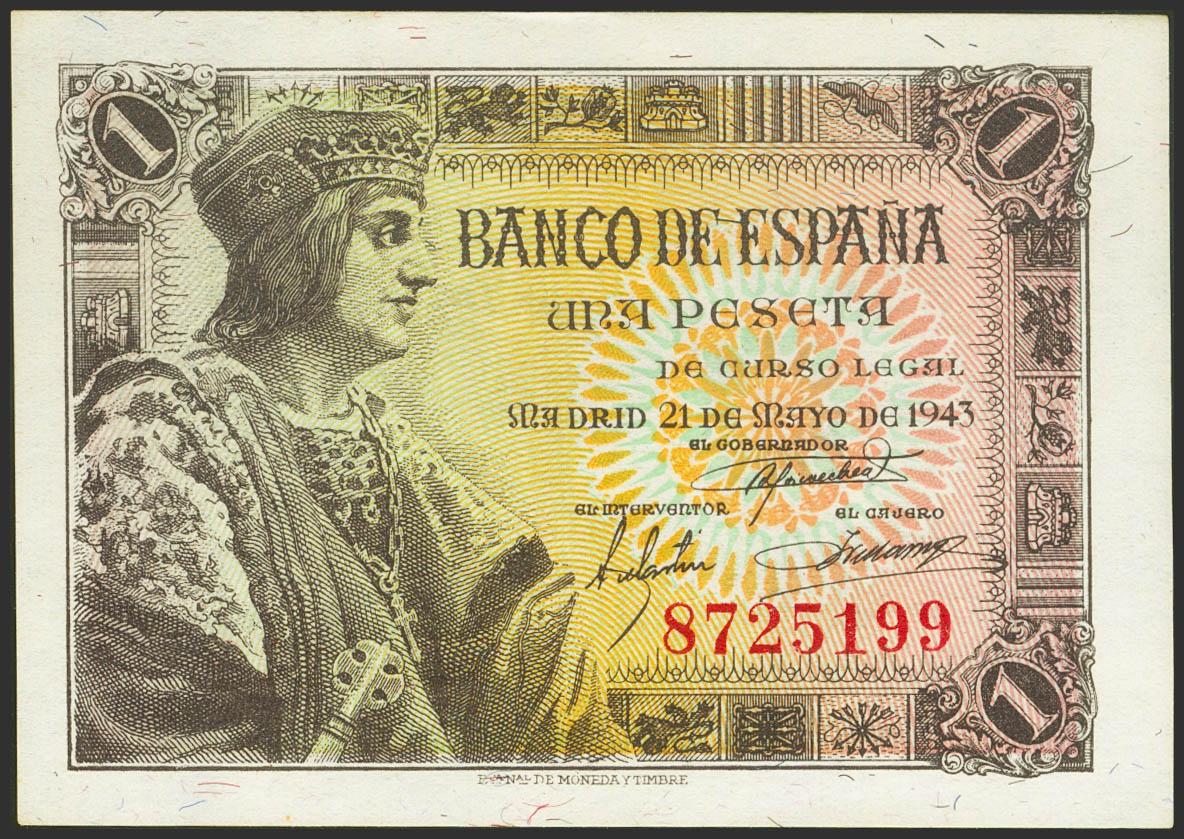 1 Peseta. May 21, 1943. No series. (Edifil 2021: 447). Original sizing. Uncirculated.