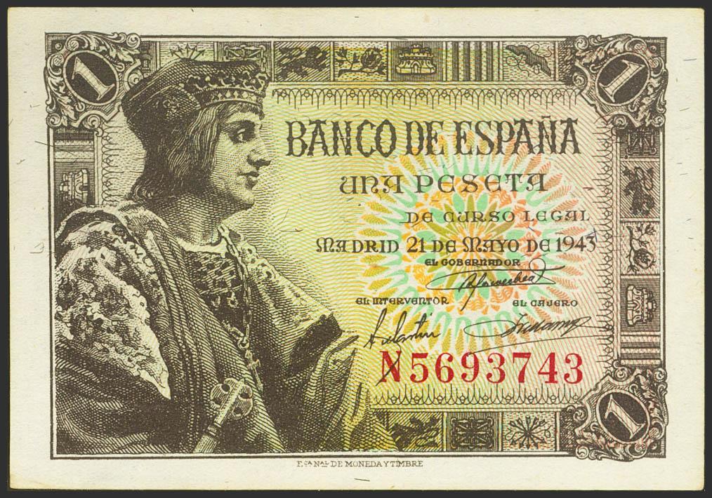 1 Peseta. May 21, 1943. Series N. (Edifil 2021: 447a). Original sizing. Almost Uncirculated.