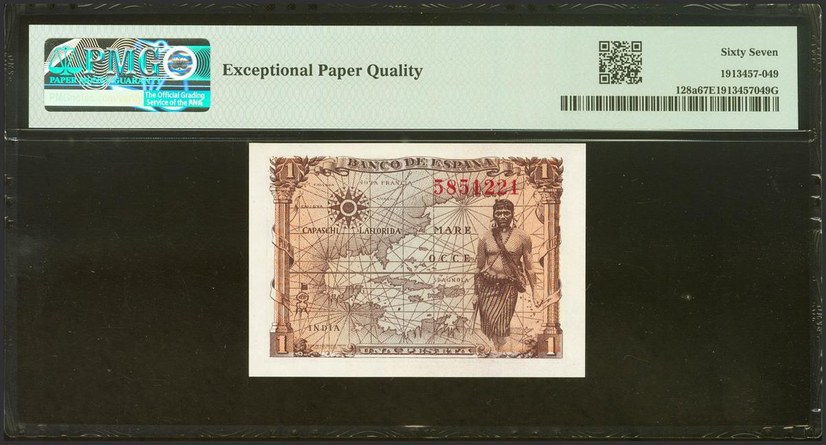 English 1 Peseta. June 15, 1945. No series. (Edifil 2021: 448, Pick: 128a). Rare in this exceptional quality and original sizing. PMG67EPQ package.